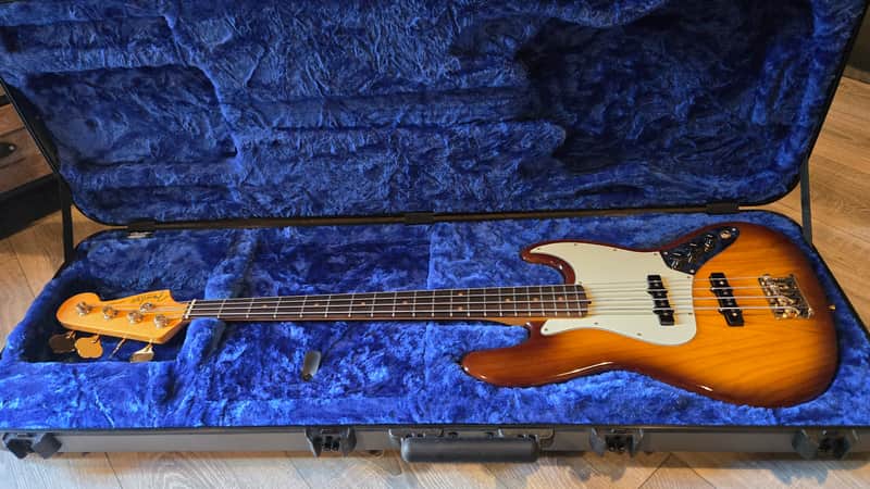 I’m selling this stunning Fender Jazz Bass 75th Anniversary Commemorative, made in the USA.This model was released in 2021 to celebrate Fender’s 75th anniversary. It features a beautiful two-tone Bourbon Burst finish with gold hardware.Ash body, maple neck with a lovely rosewood fingerboard and gorgeous red dot inlays.The bass comes factory-equipped with Fender Custom Shop ‘60s pickups.Hi-mass bridge with string-through-body design.This bass has incredible sustain and delivers that classic Jazz Bass tone with a distinctly vintage character. It really growls under the fingers. Slap playing is an absolute joy, both because of the sound and the great playing comfort provided by its slim, smooth neck.It is in near-mint condition. Sold with its original Fender flight case, adjustment tools, and certificate of authenticity.